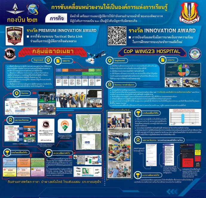 เมื่อวันที่ ๔ กันยายน ๒๕๖๘ พลอากาศเอก พันธ์ภักดี พัฒนกุล ผู้บัญชาการทหารอากาศ เป็นประธานพิธีเปิดงานมหกรรมการจัดการความรู้ นวัตกรรม และกิจกรรมคุณภาพ กองทัพอากาศ ครั้งที่ ๔๓ ประจำปี ๒๕๖๘ "บูรณาการจัดการความรู้มุ่งสู่ UNBEATABLE AIR FORCE และตอบสนองภารกิจกองทัพอากาศ" ในการนี้ นาวาอากาศเอก นทัย เมืองมณี ผู้บังคับการกองบิน ๒๓ มอบหมายให้นาวาอากาศเอก รักพงศ์ เถื่อนนาดี เสนาธิการกองบิน ๒๓ พร้อมด้วย ข้าราชการกองบิน ๒๓ เข้าร่วมงานฯ ณ หอประชุมกองทัพอากาศ โดยภายในงานฯ กองบิน ๒๓ ได้รับรางวัลระดับ INNOVATION AWARD 2025 ประเภท KM กลุ่ม COP Wing 23 Hospital และรางวัล PREMIER INNOVATION AWARD 2025 ประเภท KM กลุ่ม พิฆาตเมฆา